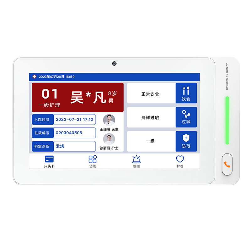 帶攝像頭-預(yù)埋款,采用觸摸屏,含手持呼叫手柄,安裝在病床上方,每個(gè)病床一臺(tái),用于呼叫護(hù)士站,患者基本信息展示。