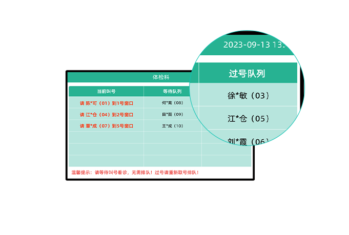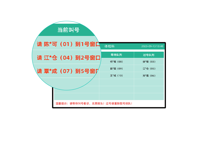 信息顯示:顯示時(shí)間日期、等候人員信息等;排隊(duì)顯示:顯示詳細(xì)的排隊(duì)信息;語(yǔ)音播報(bào):發(fā)音精準(zhǔn)清晰,支持呼叫患者及醫(yī)生;多種規(guī)格可選:可定制32/43/55寸等多種規(guī)格。