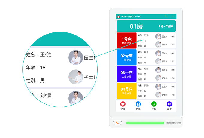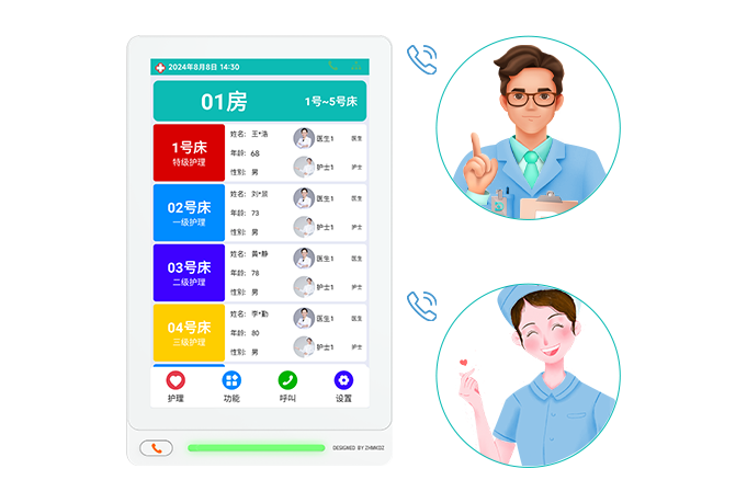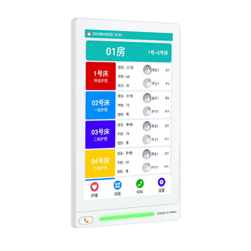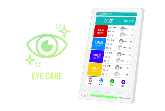 房號及床號顯示,一目了然,護工查房更方便,方便護工或家屬尋找,能一鍵呼叫護工或呼叫護理,可發(fā)布宣教文本及視頻,高清顯示,光線柔和不刺眼。